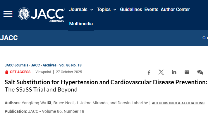 就上述最新推荐,美国心脏病学会杂志(JACC)特邀北京大学临床医学高等研究院武阳丰教授及全球该领域专家共同撰写专家述评,介绍支持指南增加低钠盐相关内容的科学证据以及采用低钠盐替代普通盐作为心血管病防控全人群策略的价值。