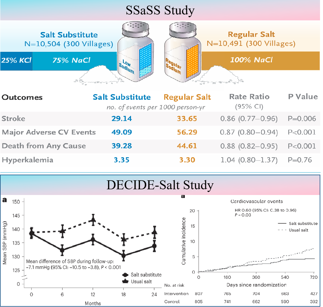 富钾低钠盐纳入高血压防治指南主要基于在中国完成的两项开创性高质量研究——SSaSS和DECIDE-Salt。SSaSS研究结果于2021年发表在《新英格兰医学杂志(NEJM)》上。该研究在中国600个村庄开展,共招募近20995例有中风史或高血压控制不好的人,干预组接受含25%氯化钾和75%氯化钠的富钾低钠盐,对照组继续使用普通食盐。经5年干预,相较于对照组,富钾低钠盐组收缩压平均下降3.3mmHg(95%CI:-4.5, -2.2),新发卒中减少14%(P=0.006)、新发主要不良心血管事件减少13%(P<0.001),全因死亡减少12%(P<0.001),且未见增加临床高钾血症事件(P=0.76)。