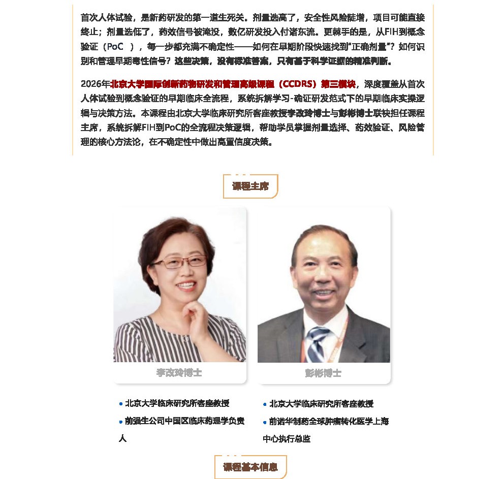 招生丨北京大学CCDRS第三模块——早期临床试验:从首次人体试验到概念验证