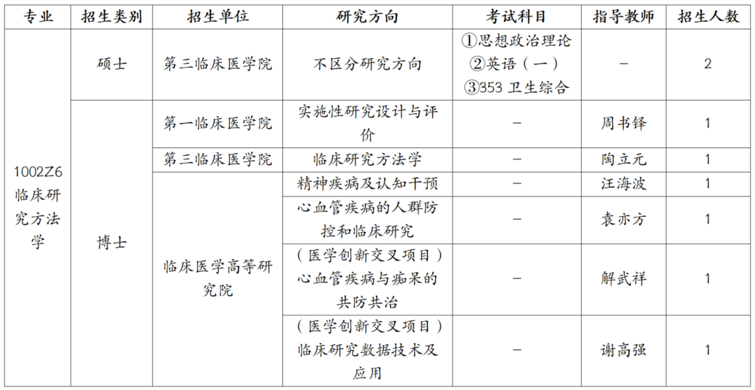 培养目标:培养德智体全面发展、高素质、复合型的临床研究高级专业人才,特别是临床研究伦理审查、项目开发与设计、数据技术与应用、统计设计与分析、项目管理与质量控制、监管科学的高级人才,以满足新时期我国临床研究发展的需要。