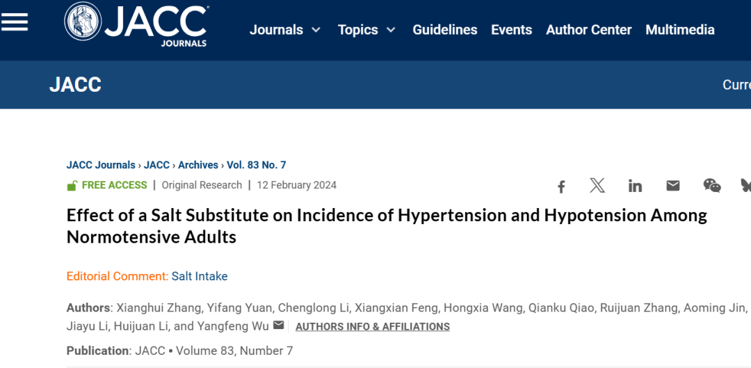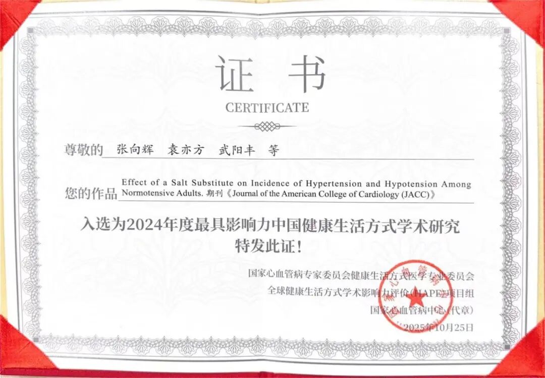 北京大学临床医学高等研究院武阳丰教授团队于2024年发表在Journal of the American College of Cardiology(JACC)杂志的研究成果“Effect of a Salt Substitute on Incidence of Hypertension and Hypotension Among Normotensive Adults”(第一作者:张向辉、袁亦方,通讯作者:武阳丰)成功入选年度最具影响力中国健康生活方式学术研究。该研究基于DECIDE-Salt研究,以血压正常的老年人为研究对象,评估了富钾低钠盐对血压正常老年人群高血压和低血压发生的影响,将富钾低钠盐的获益和风险证据延伸到血压正常人群中。研究发现,与普通食盐组相比,低钠盐组高血压发病率降低了约40%,且未增加低血压风险。
