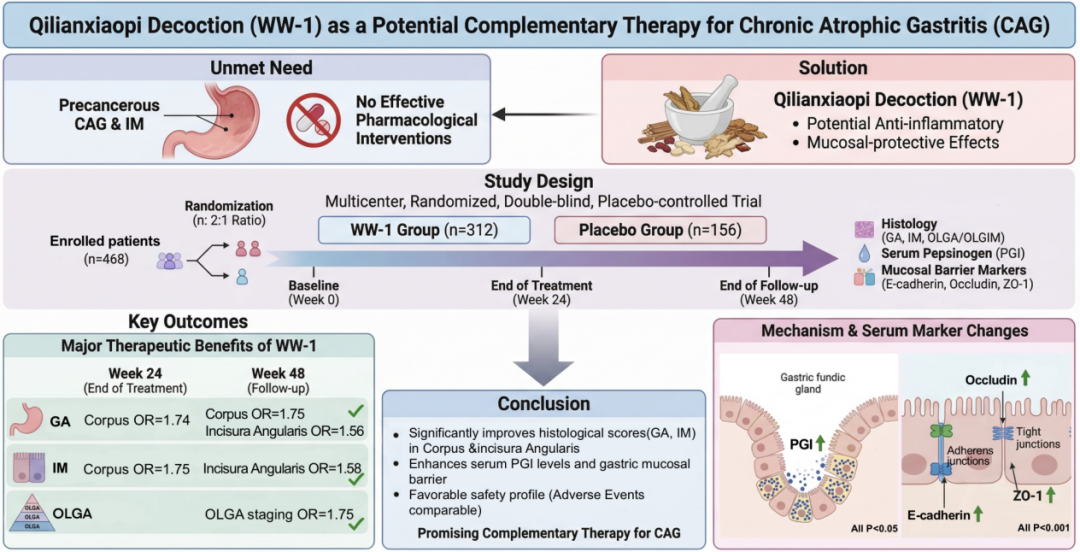 该研究采用多中心、随机、双盲、安慰剂对照设计,以高质量的循证医学证据,证实了中药制剂芪连消痞方(WW-1)可改善胃黏膜萎缩与肠上皮化生,为胃癌前病变的防治提供了中国方案。望京医院杨洋、北京大学临床研究所秦宗实、望京医院独思静和方霜霜为共同第一作者,望京医院张平、魏玮为共同通讯作者。北京大学临床研究所秦宗实和马燕军对本研究关键数据核查、统计建模、结果阐释和论文审修等方面提供了方法学支持。